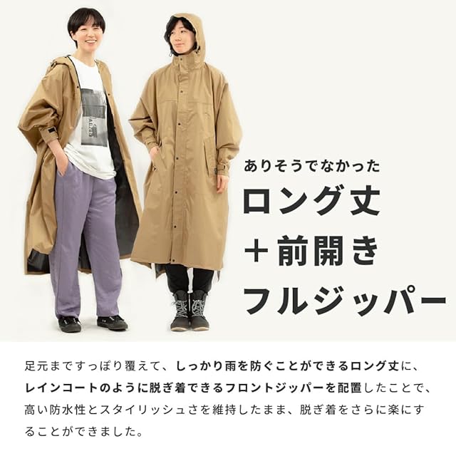 日常での使いやすさを重視し、街歩きや自転車運転で便利な機能が満載のレインポンチョです。ユニセックスで着用していただけるよう落ち着いたカラー展開で、雨上がりもアウター感覚で羽織っていただけます。