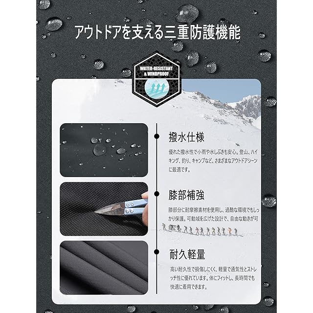 【デザイン】ウエストサイドにゴムを使用し、体にぴったりフィット、着脱も簡単です。膝部分には高耐摩耗性素材を使用し、人間工学に基づいた縫製デザインにより、十分な可動域を確保しています。