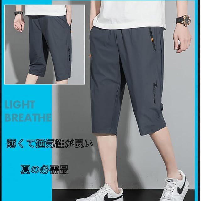 夏服アイスシルクスポーツ ハーフパンツ クロップドパンツ メンズ 七分丈 半ズボン アウトドア ショートパンツ ボトムス 大きい サイズ ゆったり 無地 涼しい 通気 速乾 快適 軽量 短パン スウェット ランニング ジッパーポケットショートパンツ grey 2XL