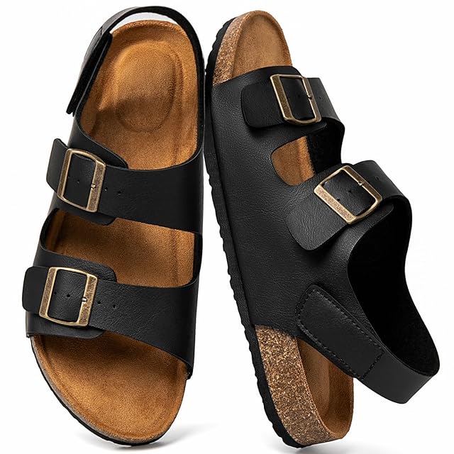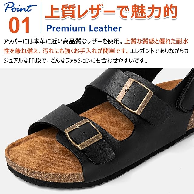 【高品質素材】高品質PUレザーを贅沢に使用し、素材感で魅せる。やや光沢のある上質PUレザーが一目で本格派の風格を主張。ダブルモンクストラップを採用したアッパーは、バックルでサイズ調整することで、甲の高低にかかわらずコルクサンダルならではのフィット感を楽しむことが可能。