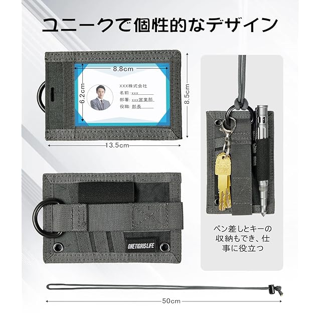 OneTigris ID カードホルダー 首掛け カードケース ペンホルダー付き ミリタリー風 仕事・通学・タクティカル 用 耐久 定期入れ ネームホルダー 社員証ケース 横縦両用 (ダークグレー)