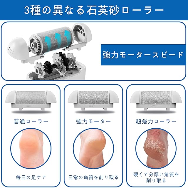 「2段スピード調節&3つ研磨ローラー」弊社の電動角質リムーバーは石英砂で作られあた3つ異なる研磨ローラーが付属されます。自分の足裏に基づいて適応なローラーを取り付け、頑固な角質もすべすべに削り取られる日常的なフットケアはこの1台で実現できます。低速モードは1600rpmとして薄い角質と敏感肌のケアに使われます。高速モードは1970rpmとして頑固の角質とたこの処理に使われます。操作が簡単でニーズに合わせて速度を調節します。便利で実用的な電動角質リムーバーです。