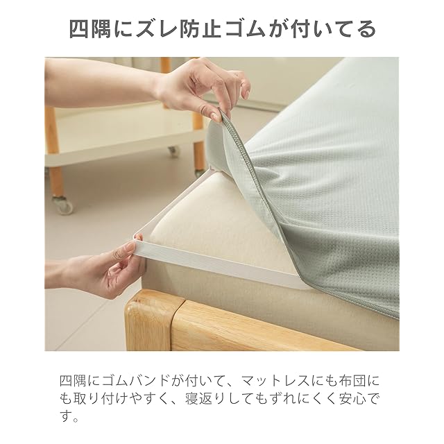 【四隅強化ゴムバンドでズレにくい】 四隅に強化ゴムバンドを採用し、取り付けや取り外しが簡単。厚み5~30cmのマットレスにぴったりフィットし、睡眠中のズレを防ぎます。
