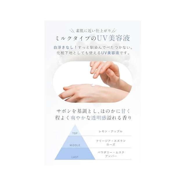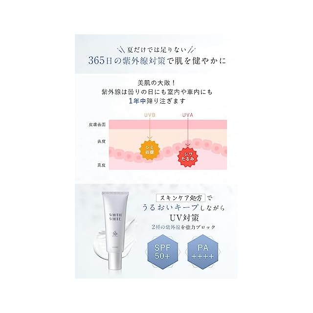 【 スキンケア感覚UVクリーム 】365日降り注ぐ紫外線。そんな美白の大敵からあなたを守るため、潤いをキープしながらUV対策ができる「スキンケア処方の日焼け止め=UV美容液」を作りました。|日本製 【 SPF50+ PA++++ 】2種類の紫外線(UVB・UVA)をダブルでカット!強力なUVカット効果でありながら 、優しい使い心地のO/W( Oil ㏌ Water)処方で、せっけんで簡単に落とせるストレスフリーな使い心地。 【 スッと馴染むミルクタイプ 】塗っていることを忘れるほどの軽い質感でベタつかず白浮きしません。「素肌に近い仕上がり」だから、化粧下地としても使ます。 【 うるおう美容成分 】「美肌×透明感×保湿」へ6種の美容成分を配合しました。(ビルベリー葉エキス・カルノシン・マンダリンオレンジ果皮エキス・テンニンカ果実エキス・パイナップル果実エキス・ヒアルロン酸)大気汚染物質などの外的刺激からしっかり守りつつ、肌のうるおいバランスも保ち、肌印象を格上げ! 【 透明感溢れる香り 】 WHITH WHITEの新しいフレグランス「Beautiful in White(サボン)」!サボンを基調とし、ほのかに甘く程よく爽やかに香ります。 『TOP』:レモン・アップル 『MIDDLE』:フリージア・スズラン・ローズ 『LAST』:パウダリー・ムスク・アンバー