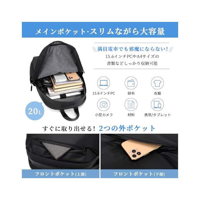【大容量収納】リュック のメインポケットには独立したパソコンポケットがあり、15.6インチのノートパソコンを完全に収納できます。PC リュックサック はA4サイズファイル、15.6インチPC、iPad、教科書、ペン、傘、衣類、飲み物、お弁当など全て一気に収納できます。リュックサックの2つの前置外ポケットは、いつでも取り出したい小物を簡単に収納できます。2つのサイドポケットはコップと折りたたみ傘を収納できます。