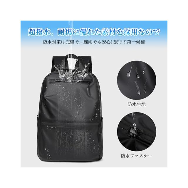 【優れた防水性生地】リュック の表面は高品質のポリエステルオックスフォード生地を採用しております。リュック メンズ は高密度な防水コーティングも施されて、非常に良い撥水効果の水をかけても中に浸み込まずに、玉になって表面を転がり落ちるので、急な雨や思わぬ傷つきから大切な物を確実に保護します。貴重品を安心して持ち運びできます。(水が入り込みにくく設計されておりますが、完全防水ではございません。予めご了承ください)
