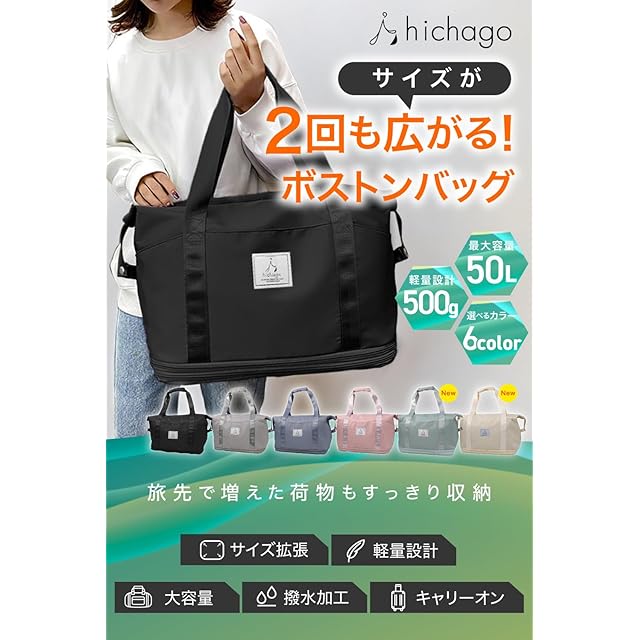hichago ボストンバッグ 【サイズが2段階広がる】 旅行バッグ 3WAY 2段拡張 撥水 大容量 軽量 キャリーオンバッグ メンズ レディース 修学旅行 アウトドア 機内持ち込み 1泊 2泊 (2段拡張, きなこ)