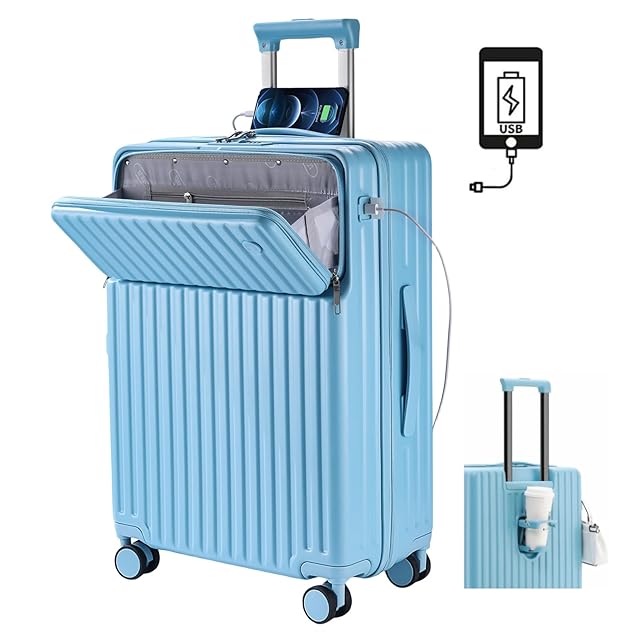 [RoamRover] スーツケース フロントオープン 機内持ち込み キャリーケース usbポート付き キャリーバッグ カップホルダー付き パソコン収納ポケット 前開き 荷物フック 充電機能 トップオープン機能 オシャレ 海外旅行出張 修学 (Sサイズ/38L/機内持込, ブルー)