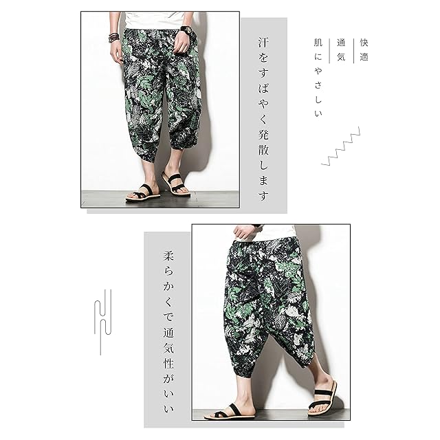 [Seranier] すててこ メンズ サルエルパンツ ズボン アラジンパンツ クロップドパンツ ワイドパンツ 総柄プリント 亜麻 男 民族風 おしゃれ ステテコ ゆったり カジュアル 7分丈 ユニセックス,グリーン,5XL