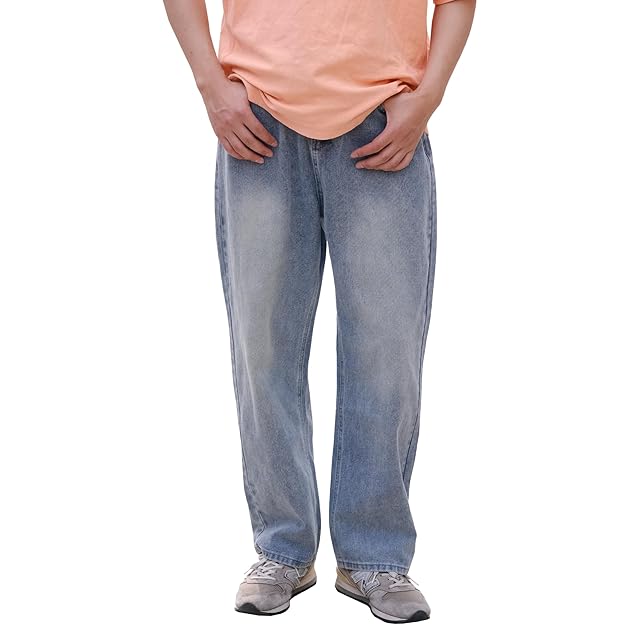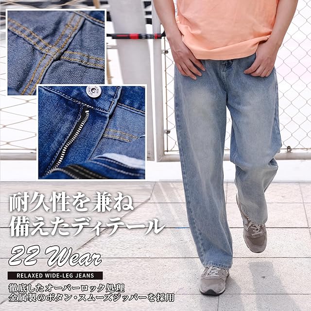 [22 Wear] ジーンズ メンズ ズボン ワイド デニムパンツ ジーパン ゆったり ルーズ ウォッシュ ダメージ (ユーズドブルー S)