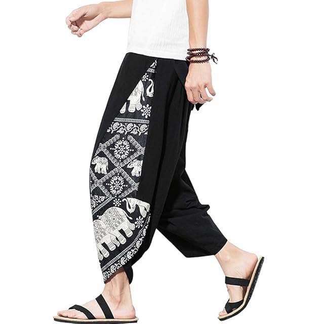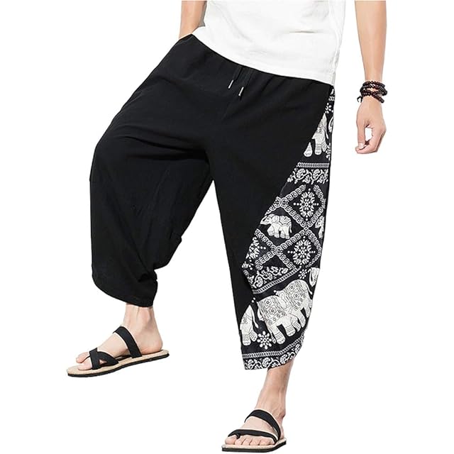 [YFFUSHI] メンズ サルエルパンツ ワイドパンツ アラジンパン メンズ 和風 パンツ M-5XL メンズ 7分サルエルパンツ 七分丈 綿 黒 全6柄 和風 調整紐