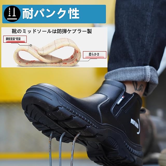【安全性能】鋼先芯:つま先部分に鋼製の先芯を入れた、作業中の意外発生時の硬物の衝撃、利器の落下が有効に防衛できます。金槌や刃物などからつま先を保護できます。突き刺し耐性のあるソール:ケブラー 繊維ミッドソールも入れた、釘などの鋭いものから足裏を守ります。