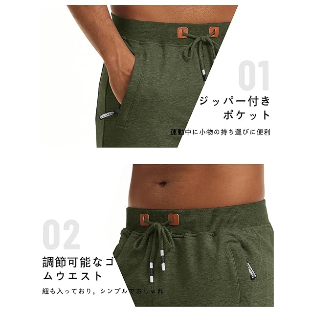 【デザイン】①調節可能なウエスト:ウエストに伸縮性があり、紐も入っており、ウエストのサイズを調節可能。②裾はリブ仕様:程良い伸縮でふくらはぎにゆるくフィット。③1つのバックポケットと2つのサイドファスナーポケットを装備。走っても跳ねてもスマホが落ちない、大変便利です。