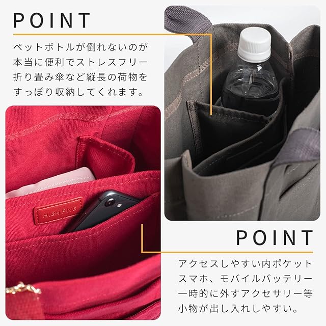 [HIGH FIVE] ミニトートバッグ 仕切り かるいかばん 帆布 多ポケット 多収納 底面ICカード マチ付き メンズ レディース 大容量 ミニトート ブランド シンプル 無地 アイボリー