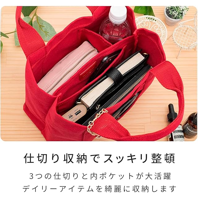 【スッキリ整頓 ミニトートバッグ】 使いやすさにこだわった3つの仕切りと内ポケットで、デイリーアイテムを綺麗に収納。 幅広マチの大容量でも中身が散らかりません。取り出しやすい外ポケットも2つ付いています。 底板には交通系ICなどにぴったりなカード入れを付属しているので、通勤通学にも便利。人気ブランドならではのこだわりがつまったアイテムです。