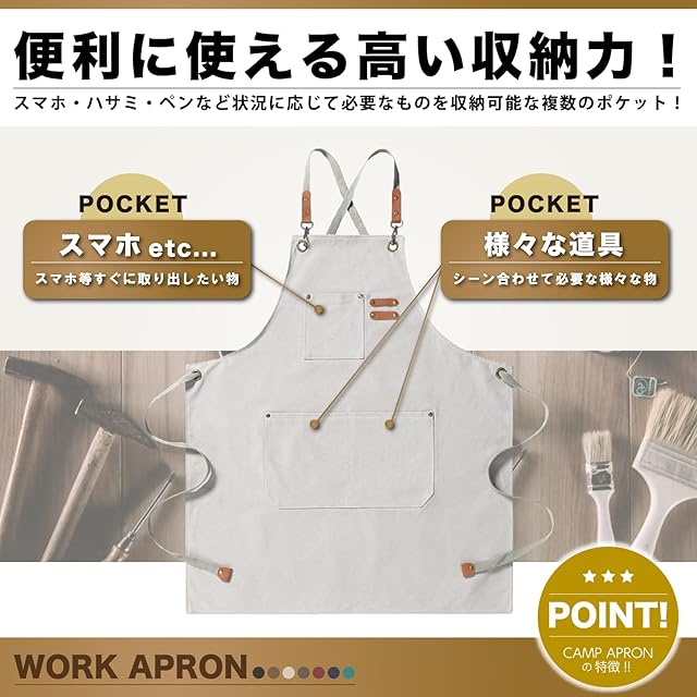 ✅【丈夫なのにお手入れが簡単!】耐久性が高く安全性に優れた厚手のキャンバス生地を使用。素材はコットン100%のため洗濯可能。アウトドアや業務作業で汚れてしまったエプロンも、お手入れ簡単で綺麗清潔に保てます。
