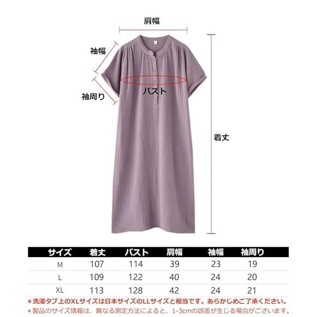 [TDIOSN] パジャマ レディース ワンピース ネグリジェ 二重ガーゼ 半袖 前半開き 柔らか 通気速乾 ルームウェア 入院 産後 マタニティ 母の日 ギフト プレゼント女性 婦人 春夏秋 (パープル, L)