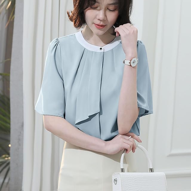 [Sueeya] スイーヤ ブラウス ボウタイ風 レディース シャツ バイカラー 半袖 トップス 着瘦せ 女性 おしゃれ エレガント 可愛い カジュアル ビジネス オフィス フォーマル 通勤 OL