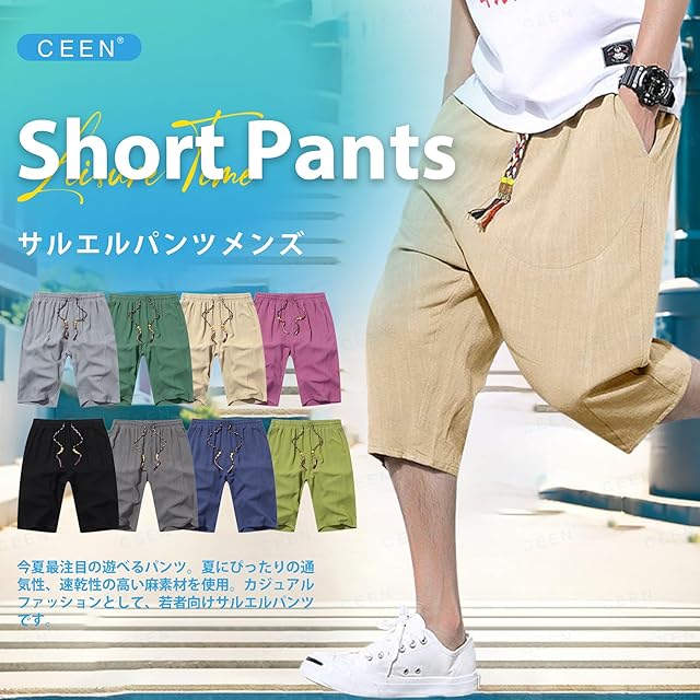 [CEEN] サルエルパンツ メンズ 麻 七分丈 夏服 無地 調整紐 ゆったり 大きいサイズ ハーフパンツ ウエストゴム 薄手 速乾 涼しい ショートパンツ スポーツ 部屋着