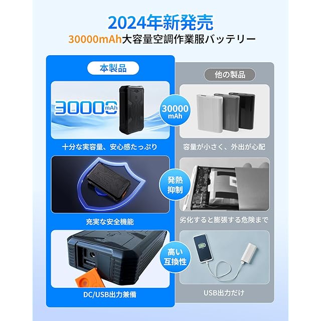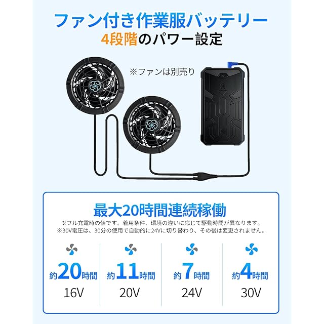【30000mAh大容量の安心感&30V高出力&長持ち】2025年30V高電圧出力大容量30000mAh空調作業服バッテリーのが新登場!バッテリーのスイッチを長押しすると電源が入り、短く押すと16V-20V-24V-30Vの周回切り替えができます。30v超高出力空調作業服バッテリーは容量30000mAhに大幅アップしながら、体積が従来より10%減少した。最先端米軍MIL規格ICチップ搭載、ほかの電池より寿命を25%伸ばす。