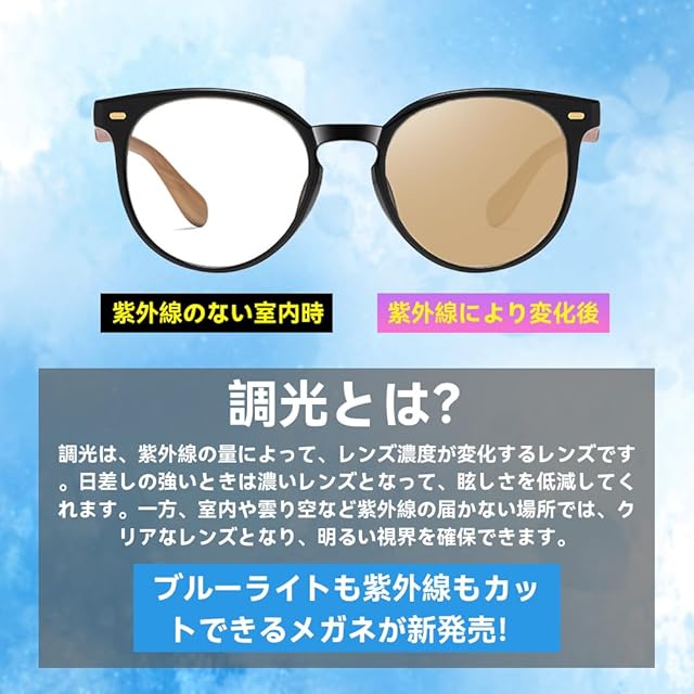 【調光変色・1本2役】室内ではブルーライトカットメガネとしてご利用いただけるので、目に有害なブルーライトをカットできます。屋外でUV、まぶしさを抑えてくれます、メガネとサングラスを掛け替える手間が無く、一つで二役の便利な眼鏡です。