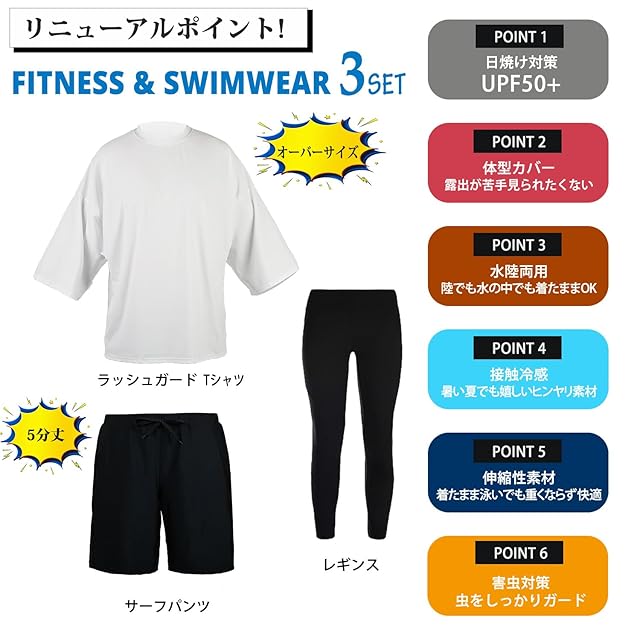 【セット内容】ラッシュガードオーバーサイズTシャツ、レギンス、サーフパンツ。