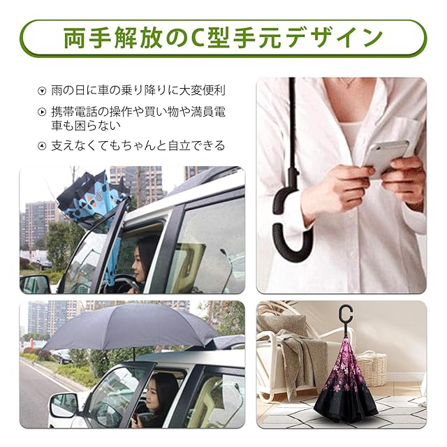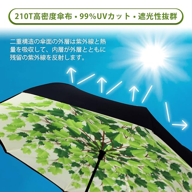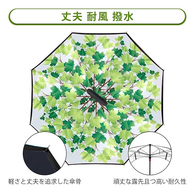 YOKITOMO 長傘 逆さ傘 丈夫 撥水 内外2枚の布の構成で耐風 熱中症対策 遮光 遮熱効果 閉じると自立可能 晴雨兼用 車用 (若葉)プレゼント ギフト