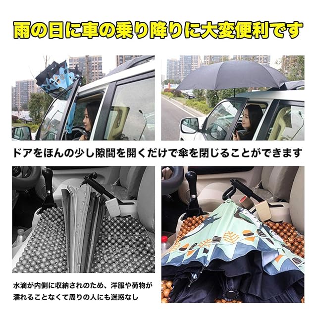 【雨の日に車の乗り降りに大変便利 収納袋付き】ドアをほんの少し隙間を開くだけで傘を閉じることができます。閉じて上に向ければほぼ雨水が落ちない。周りも、衣服も特にズボンが濡れない。