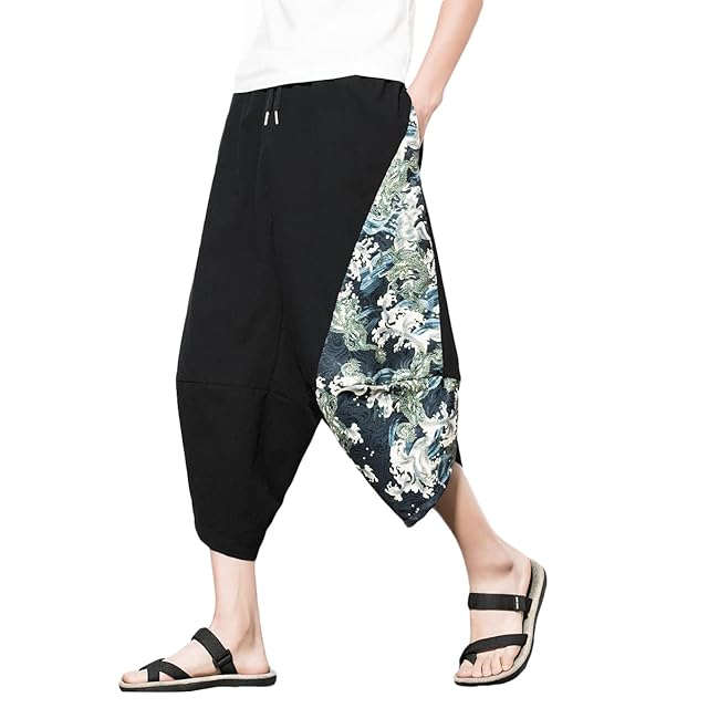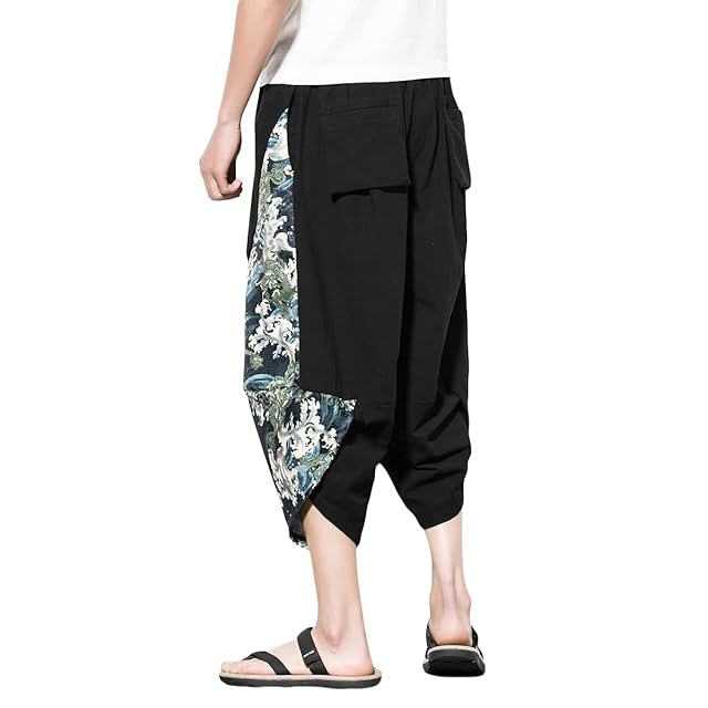 [YFFUSHI] メンズ サルエルパンツ ワイドパンツ アラジンパン M-5XL メンズ 7分サルエルパンツ 七分丈 綿 黒 全6柄 和風 調整紐