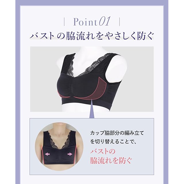 【バストの脇流れを防ぐ】就寝中や、くつろぎ時のバストの脇流れを防ぐ、独自の構造【軽いつけごこち】よく伸びる編み立て成型で、フィット感がよい