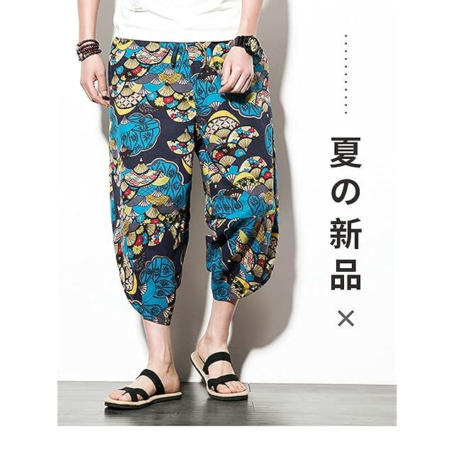 [Seranier] すててこ メンズ サルエルパンツ ズボン アラジンパンツ クロップドパンツ ワイドパンツ 総柄プリント 亜麻 男 民族風 おしゃれ ステテコ ゆったり カジュアル 7分丈 ユニセックス,アーミーグリーン,3XL