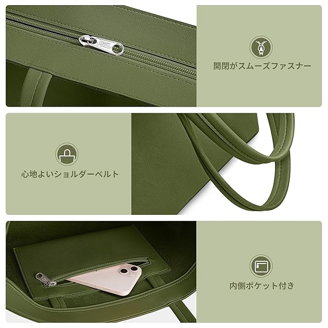 [KALIDI] トートバッグ ビジネス ショルダーバッグ 大容量 レディース メンズ 肩掛けバッグ 大きめ エコレザー 合皮 シンプル 無地 A4 横型 男女兼用 内ポケット有り ファスナー付き (ダークグリーン)