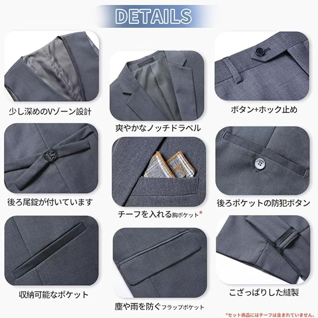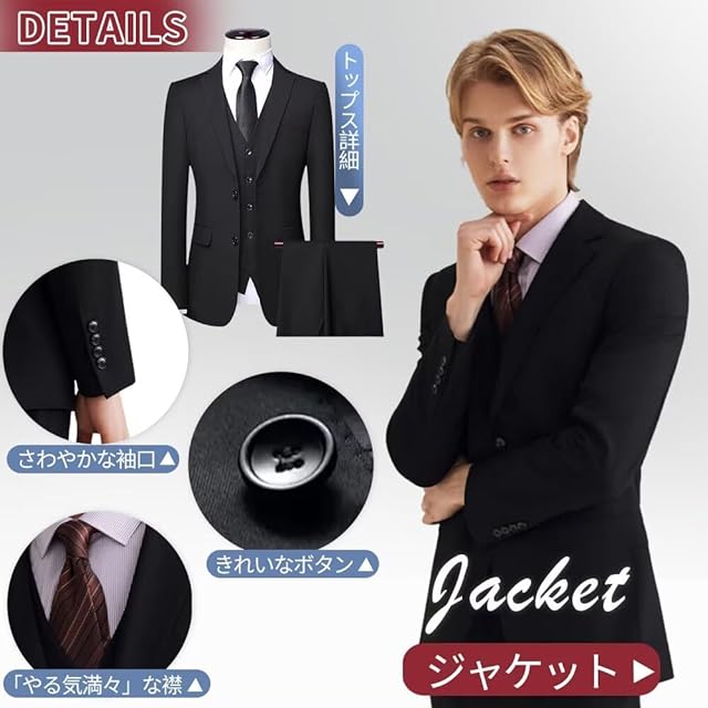 【デザイン&仕様ポイント】ポケットの数:2つサイドポケット 1つ胸ポケット 2つインナーポケット。/ジャケットの袖口は調整しやすいようにあえて縫い代を多めに残し、釦ホールを開けない仕様となっております。/立体縫製を取り入れたメンズスーツ3点セットが体のラインに合わせて着こなしまして、男の色気を引き出します。