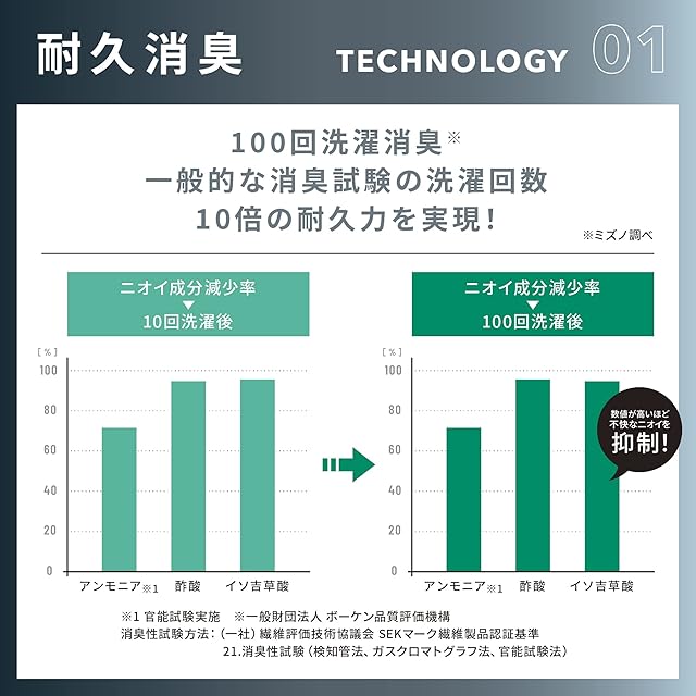 生地自体に消臭機能搭載、100回洗濯後も効果が持続します。