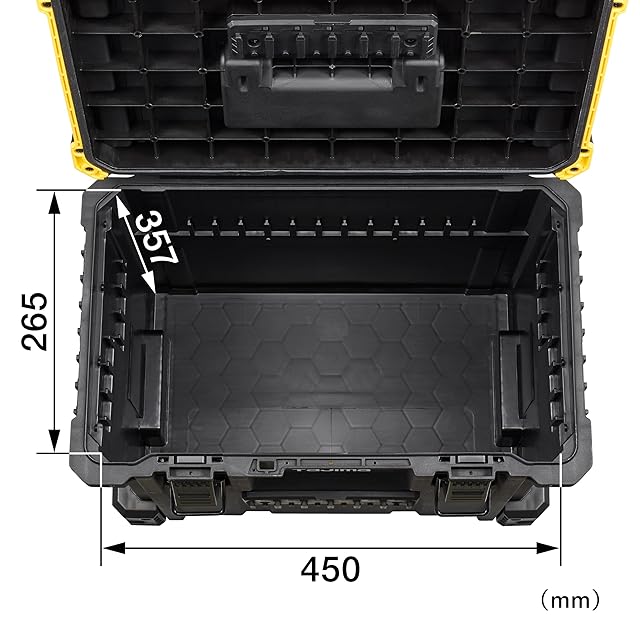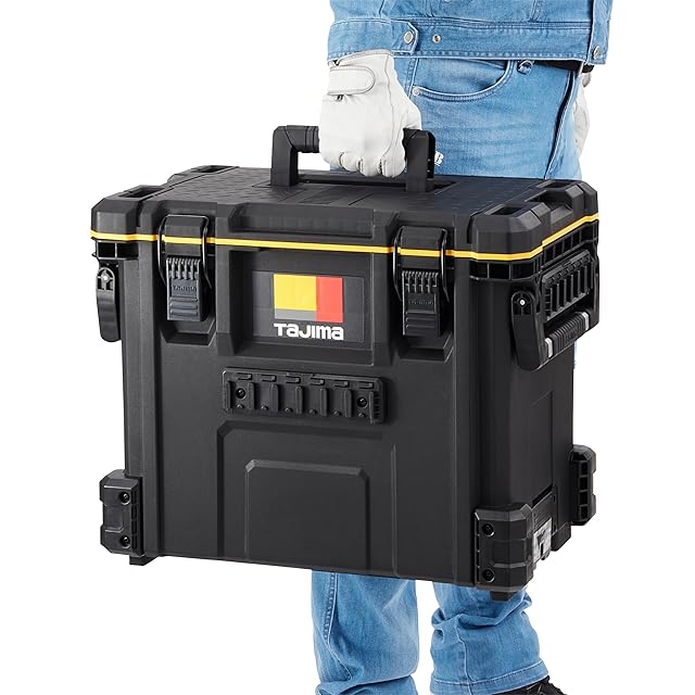 商品名:タジマ セフシステム セフツールボックス TB-TBOX 大容量仕様(最大積載量50kg) 内・外側にセフホルダー機能54個 重ねて置くだけで連結する荷崩れ防止仕様 セフ台車との連結も可能 高耐久設計のフタを採用(耐荷重100kg) 片手・両手持ちができる2wayハンドル 防塵・防水性能IP65