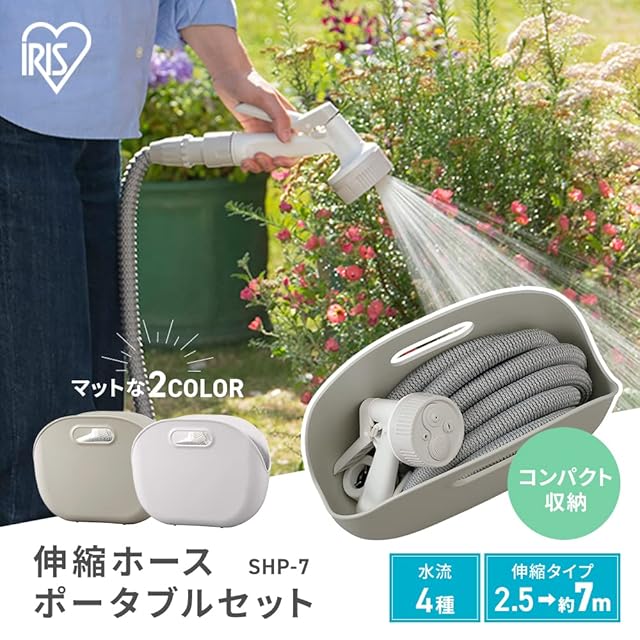 アイリスオーヤマ(IRIS OHYAMA) 伸縮ホース 最大7m 便利な収納ケース付 軽量コンパクト 多機能ノズル ホワイト SHP-7 ホースリール