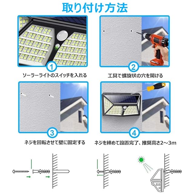 【配線不要・設置簡単・IP65防水防塵】ソーラーライト屋外防水人感センサーはシェルに信頼材質ABS樹脂を採用するから、浸水、変形、破裂などの心配はいらない。IP65防水規格に達して、大雨や雪などの悪天候にも耐えられます。ソーラーセンサーライトは動作温度は-10℃~50℃になり、オールシーズンで楽に使えます。ネジセットが付属するため、壁に取り付けことができます。ウォールライトとして利用可能。簡単に装置できるから、女性とお年寄りも気軽に使えます。