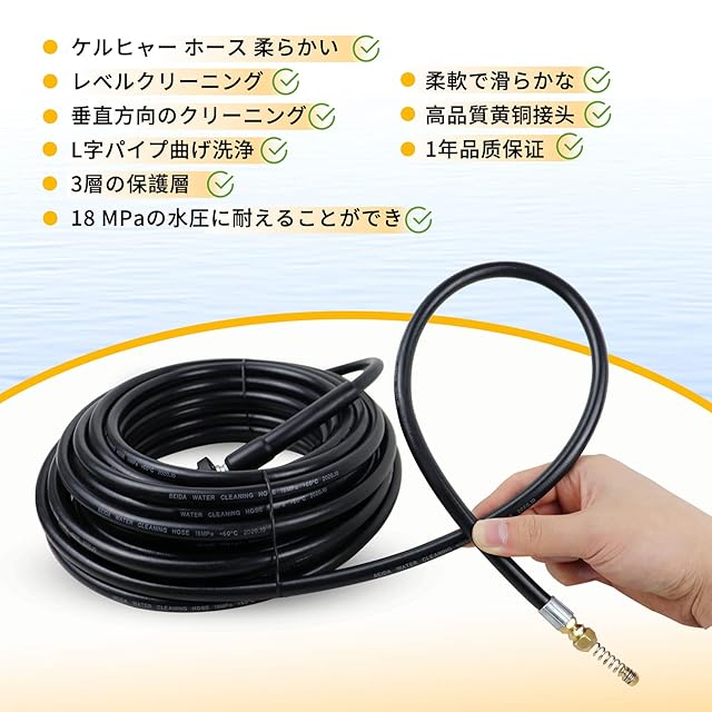 汚れが詰まって臭いを発するダウンパイプや排水溝に、まだ悩んでいませんか? mendoyoは、パイプクリーニングに関するあらゆる問題を解決するために、より良い品質の製品と効率的なアフターサービスを提供しています。<br> 製品情報です 仕様:ダクト掃除用ホース*1 オレンジ色の収納袋*1<br> 長さ:10M<br> 材質:PVCラバー<br> 圧力:18Mpa<br> 適用機種:ケルヒャーK2 K3 K4 K5 K6 K7 JTK with lavor(トリガーガンとプレッシャーウォッシャー)。<br> 製品の特徴<br> リバースジェット:(4つの噴射口)高圧の水を4方向から噴射し、パイプ内の汚れを落とす<br> 柔軟性:90度曲げてL字型に折りたたむことができ、押したり引いたりを繰り返すことで目詰まりしたパーツの汚れを取り除くことができます。<br> 携帯性:円形に折り曲げて、オレンジ色の収納袋(付属)に入れれば、簡単に収納でき、携帯に便利です。<br> アプリケーション: トイレフードの排水口洗浄、キッチンの排水口、洗濯機の排水口、屋外の塩ビ管洗浄に<br> 注意:高圧ガンの水を使用しないでください。大きな圧力が発生しますので、ノズルからの水に手で触れないようにしてください、損傷の原因になります。<br>