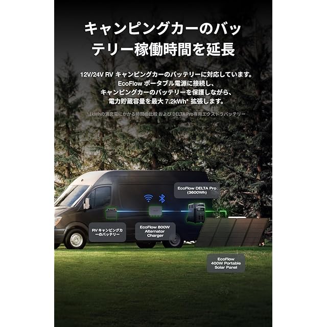 【キャンピングカーのバッテリー稼働時間を延長】12V/24V RV キャンピングカーのバッテリーに対応しています。EcoFlow ポータブル電源に接続し、キャンピングカーのバッテリーを保護しながら、電力貯蔵容量を最大 7.2kWh* 拡張します。(*EcoFlow DELTA Pro および DELTA Pro専用エクストラバッテリー)