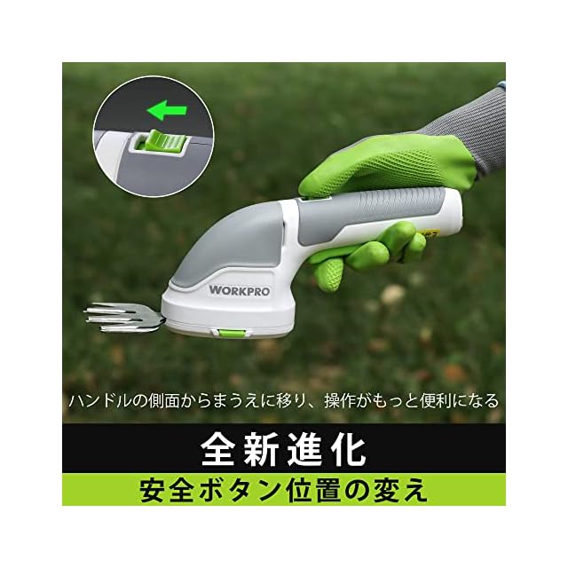 商品名:[安全ボタン進化]WORKPRO 芝生バリカン ガーデンバリカン 生垣バリカン 芝刈り機 一台二役 コードレス 3.6V充電式 Type-C充電ポート 二重安全ロック ブレード2枚付 バリカン刈幅75mm トリマー刈幅120mm 最大開口7.8mm 剪定 植木 園芸 機種型番W159025