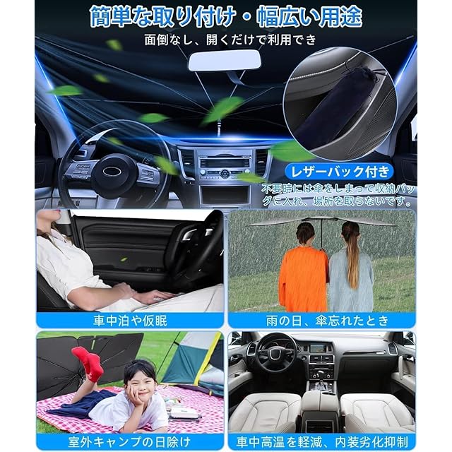 【耐久性が優れる&涼し】この 車 サンシェード は効率的な複合チタン銀接着剤を採用し、傘面:ナイロン、複合チタン銀接着剤、車内の温度を効果的に下げ、ダメージや経年劣化を防ぎます;傘骨:アルミニウム合金、鋼骨製;傘の柄:ABSプラスチック。 サンシェード は熱を遮断して太陽光を反射し、99.5%の紫外線を効果的に遮断し、内装劣化防止。車内の温度を軽減し、エアコンへの負荷がへり、省燃費が向上します。駐車の度に気持ちをより涼しくしてくれます。
