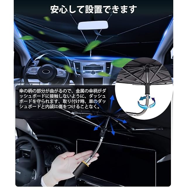 【2025年モデル 新型】ユニークなデザインが採用されます。曲がる可能な傘柄、ダッシュボードの高低により、傘柄を折り曲げて調整できます。金属の傘柄がダッシュボードに触れないように、その摩擦からダッシュボードが守られます。取り付け時、車のダッシュボードと内装に傷をつけることなく、安心して設置できます。1人でも簡単にできます。閉じると収納バッグに入れて、持ち運びやすくてドライブの邪魔になりません。ドアのサイドポケットやグローブボックスなどの中にも収納できるので、車内空間が狭い車にもおすすめです。