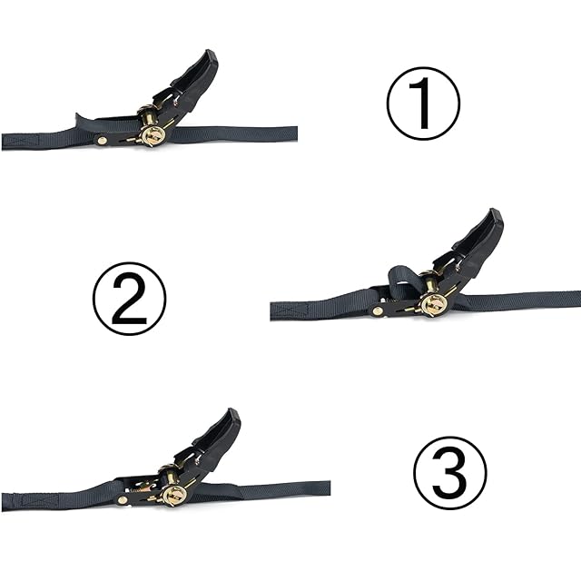 【簡単操作】ベルトの締付け方:ハンドルが水平でない状態で、両手でハンドルを持ち、引っ張ることを缲り返し、開いたり閉じたりすることで、ベルトを巻取ります。ベルトの緩め方:凹んだ黒いゴムの位置を押さえて、グリップを水平に調整して、ベルトを引き出せばいい。