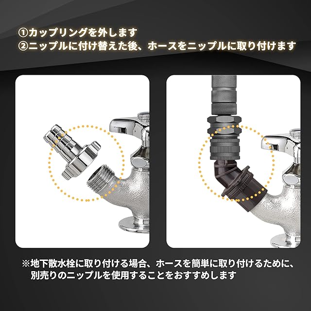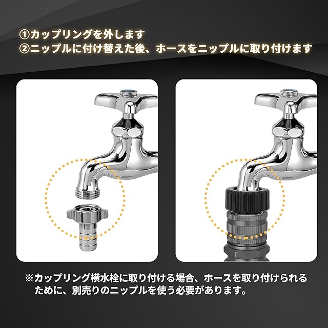 【ご注意】(1)本商品はキッチンや風呂場の蛇口からの使用ではありません。(2)ホースのコネクタはワンタッチタイプではないため、ホースを蛇口に取り付ける前に必ず取扱説明書をお読みください。(3)カップリング付き横水栓を使う場合には別売りのニップルを使用する必要があります。(4)商品パッケージに付属される蛇口用ニップルは直径16mmまでの蛇口の吐水口に取り付けられます。直径16mmより大きい蛇口を使う場合には別売りのニップルを取り付ける必要があります。(5)蛇口用ニップルが取り付けている状態で、蛇口との間から水漏れが発生する場合、蛇口用ニップルを蛇口の吐水口のセンター部に意識して真っ直ぐ押し込み、周囲のネジ(3ヶ所)を更に均等に締め込んでセットしましたところ、水漏れはなくなります。(6)冬に気温が氷点下の環境で散水ノズルを保管しないでください。低温環境で散水ノズルが破損しやすいです。