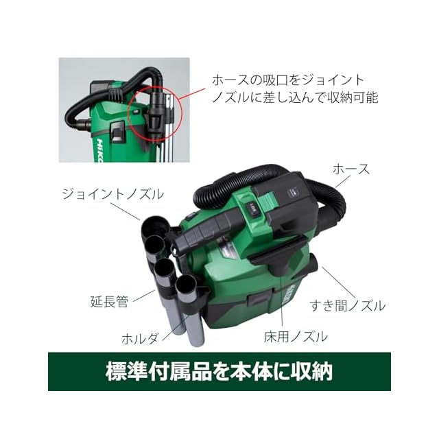 標準付属品:ホース(内径φ30×0.5~2.5m)、ジョイントノズル、延長管、床用ノズル、すき間ノズル、フィルタ(乾式専用)、HEPAフィルタ、ショルダーベルト、ホルダ(ねじ2個)