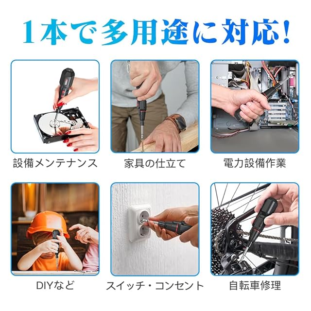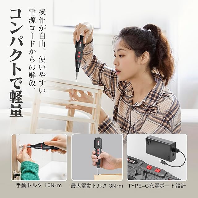 【パッケージ内容&品質】電動ドライバー本体*1、ビット*14、USB電源ケーブル*1、日本語の取扱説明書*1が付属しています。1年期間をご提供いたします。ご連絡の方法:「アカウントサービス」→「注文履歴」→「販売元」→「質問する」