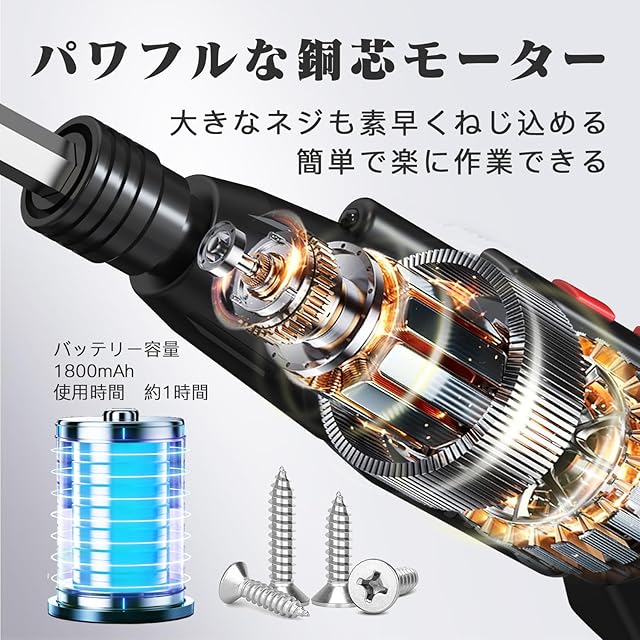 電動ドライバー :電動ドライバーは強力な銅芯モーターを使用し、ハイパワーで寿命の長い一品です。ワンボタンでねじり方向を自由に切り替えられます。 電動ドライバ:1800 mAhの大容量バッテリーを内蔵し、大約2.5時間充電。1時間連続使用することができる。注意:5 V/1 Aアダプタを使用して充電してください。