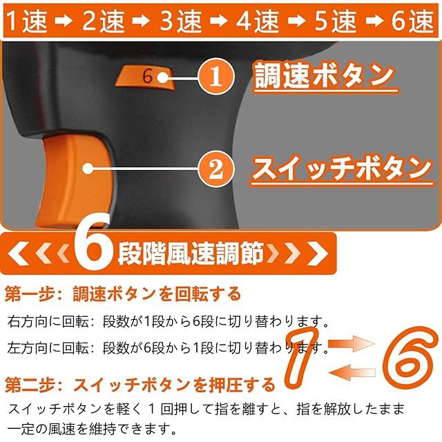 【6 段階風速ロック・ノズル付き】この送風機は 6 段階の変速機能を備え、ノズルが付属しており、必要に応じて取り付け・取り外しができる 2 用仕様です。操作がよりフレキシブルかつ簡単になり、あらゆるシーンをカバーできるクリーニングツールと呼べます。【1 速-微風モード】ペットの毛髪乾燥、精密機器のほこり除去【2 速-弱風モード】デスクやコンピュータ本体のほこり除去【3 速-中風モード)】肩丈程度の髪の速乾、車内清掃【4 速-強風モード)】浴室の除湿、園芸作業【5 速-超強風モード)】広範囲の水たまり処理【6 速-竜巻モード)】工業用清掃、緊急排水対応