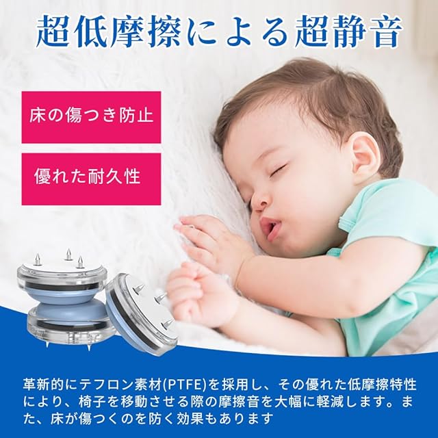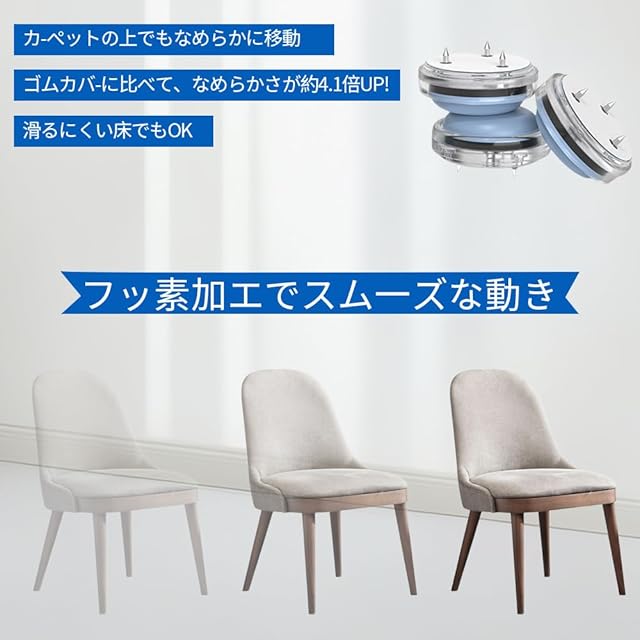 フッ素加工で滑らか&静音移動 : この椅子脚カバーはフッ素フィルム加工により、非常に低い摩擦係数を実現しています。これにより、滑りにくいカーペットや床でもスムーズに、静かに椅子を動かすことができます。従来のゴム製より5.5倍滑らかで、引く時のガリガリ音も激減します。椅子を引いたり動かしたりする際の摩擦音を大幅に軽減し、静かな環境を保ちます。