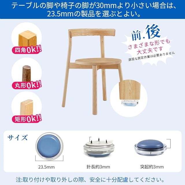 サイズ選び不要・木製脚にどんな形状でも取り付け可能:この椅子脚カバーは、コインサイズ以上の木製椅子脚であれば、形状に関係なく取り付け可能です。四角型、丸型、長方形などはもちろん、前後の足の形状が違うデザインの椅子にも対応可能です。めんどうな採寸作業は不要です。※ご注意:木製脚専用です(金属・斜め脚・点接点脚は非対応)。安全な取り外しのため、説明書の手順をご確認ください。